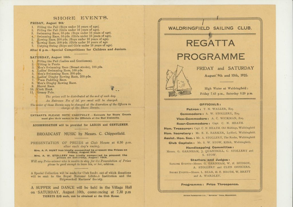 In the Spring of 1921 the first minute book of the Sailing Club records the meeting at Gorse Cabin to form a Sailing Club for the Village. Sir Clifford Paterson (a regular visitor from London and married to Daisy Ogden), Mr Harry Nunn (Boatyard) and Mr T.N.Waller (Villager) were President, Secretary and Treasurer respectively with Mr A.W.Stollery (Born Waldringfield) as Chair. A. Quantrill, R. Button Jnr & C. Rix (all Villagers) formed the rest of the Committee and so the Waldringfield and Hemley Sailing Club was born, ‘club sailings to be every fortnight + holidays, Tide and weather permitting’. Waldringfield Regattas were sailed each summer.