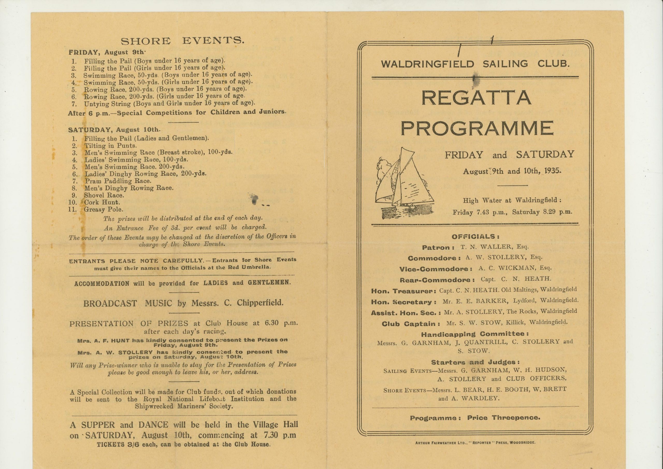 In the Spring of 1921 the first minute book of the Sailing Club records the meeting at Gorse Cabin to form a Sailing Club for the Village. Sir Clifford Paterson (a regular visitor from London and married to Daisy Ogden), Mr Harry Nunn (Boatyard) and Mr T.N.Waller (Villager) were President, Secretary and Treasurer respectively with Mr A.W.Stollery (Born Waldringfield) as Chair. A. Quantrill, R. Button Jnr & C. Rix (all Villagers) formed the rest of the Committee and so the Waldringfield and Hemley Sailing Club was born, ‘club sailings to be every fortnight + holidays, Tide and weather permitting’. Waldringfield Regattas were sailed each summer.
