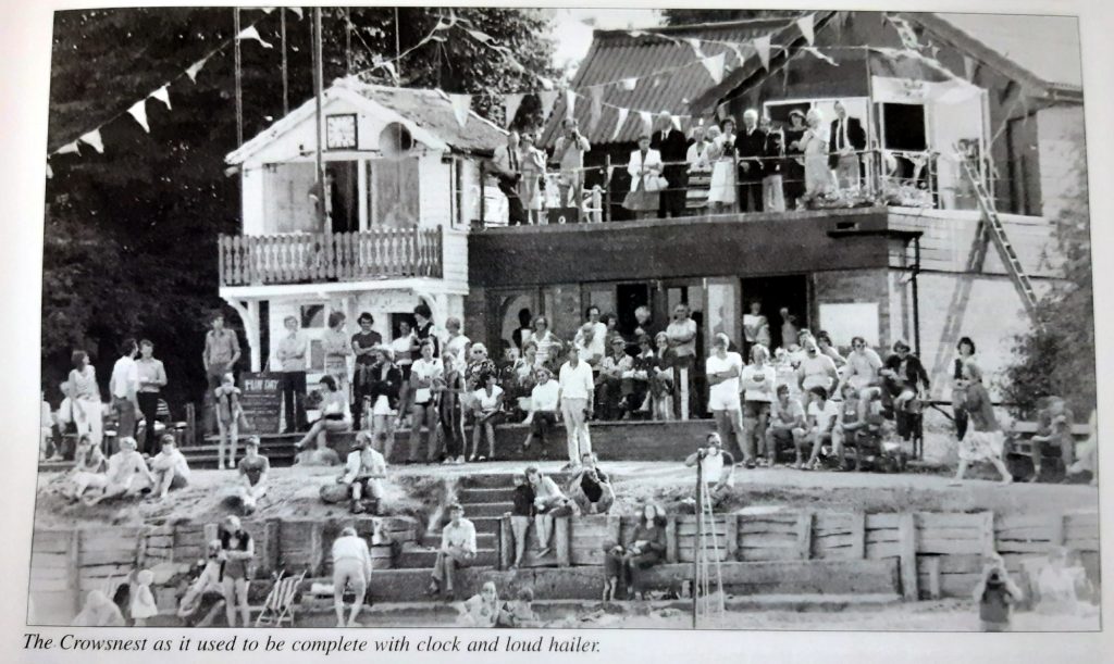 During the 1970s more plans were drawn up to rebuild the Clubhouse and to replace it with a more modern brick building. One of the problems was that the club was built on land that was on a short lease so it wasn’t really worth the investment. However Peter Fraser managed to obtain a longer lease on the current site and secure a permanent car park which made the rebuild a better prospect. Many fundraising events were planned by Antony Mason and his committee and with the help of a grant from the Sports Council and some donations and loans from members and the new building was opened by Poppy Palmer, the President’s wife, on 17th July 1982. John Waller held a short service on the terrace accompanied by Charlie Taylor on his accordion and there was a sail past of 80 + yachts and dinghies. Ted Kaznica led the procession followed by the police launch, ‘The Ian Jacob’ and the 87 foot ‘Adelante’ dressed overall. The new clubhouse originally incorporated the older Crow’s Nest including the hole in the floor created when George Goddard had fired the starting gun without manging to open the side window in time and fired the blank into the wood floor. On another occasion Mr Steele had fired it through the glass thinking he had already opened the window. The old Crow’s Nest was however replaced shortly afterwards.